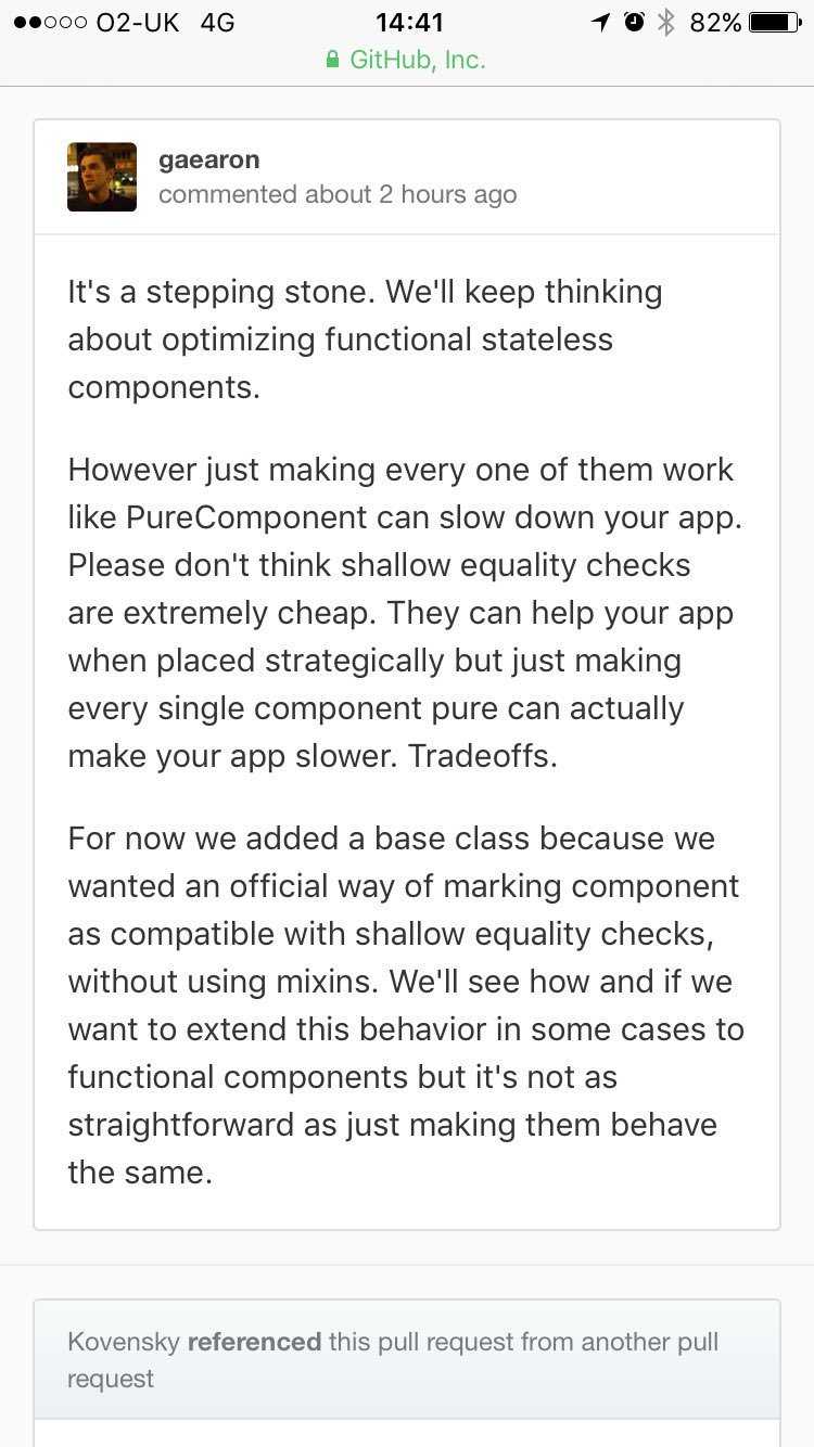 接着在 2017 年 1 月, Dan 又发了一条 来强调这个观点. 所以, 可以确定的是, 任何地方都是用 PureComponent 被认为是有害的.